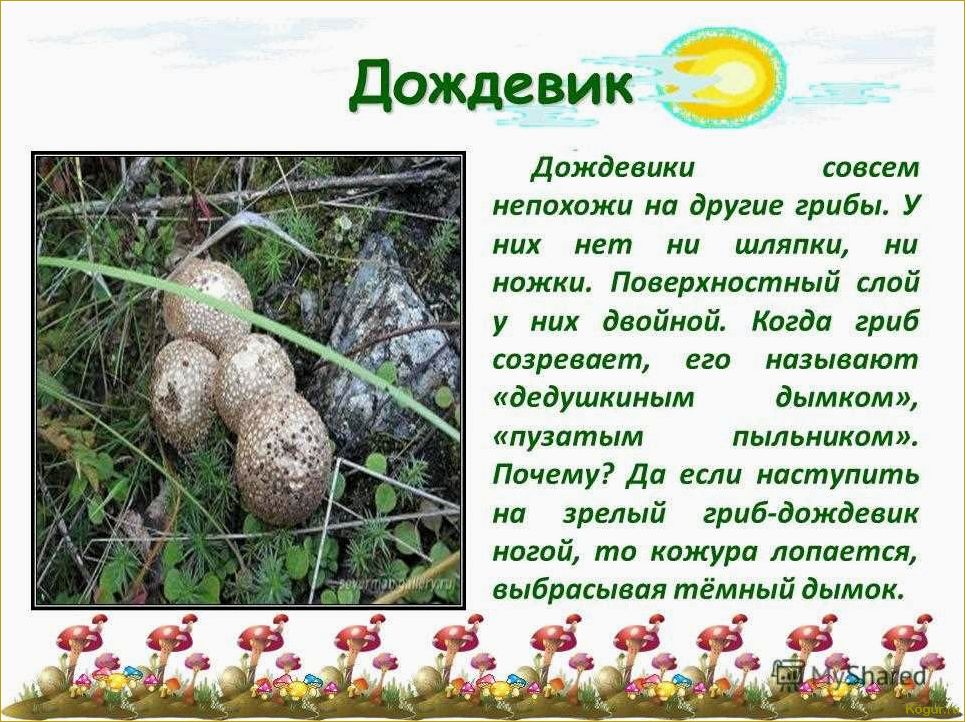 Гриб дождевик известен своими полезными свойствами и ценными питательными веществами. Он является источником витаминов, минералов и антиоксидантов, которые благотворно влияют на организм человека.